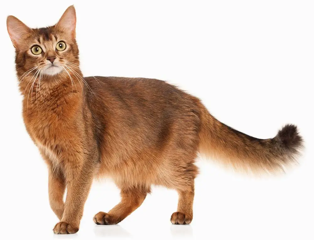 Las colas gruesas, los ojos de almendras y las orejas puntiagudas caracterizan a los somalíes. A menudo se comparan con los zorros. Los abrigos pueden venir en veinte colores, pero tienden a ser delgados y suaves.